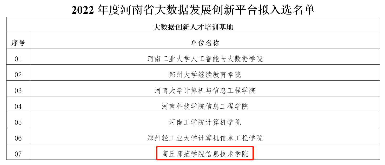 近日,河南省工业和信息化厅发布2022年度河南省大数据发展创新平台名单(豫工信数据〔2022〕102号),LETOU国际米兰官网信息技术学院入选首批“河南省大数据创新人才培训基地”。