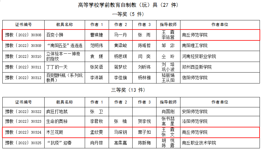 近日,河南省教育厅《关于公布第十九届河南省中小学幼儿园自制教(玩)具暨学生科技创新小制作小发明评选活动结果的通知》(教资保〔2022〕268号)下发,LETOU官网教师教育学院学前教育专业2019级学生曹瑛婕、马一丹、张雨设计的《百变小狮》荣获一等奖,2020级学生孟欣雯、马琛玥、栗子设计的《木兰花鼓》荣获三等奖。